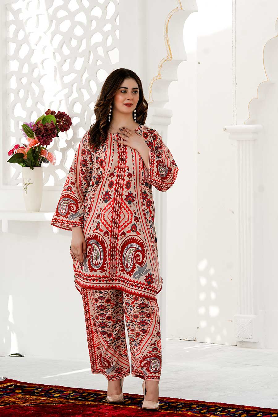 Bold and rooted in heritage, Gulnaar Crimson is a vibrant celebration of traditional design. The