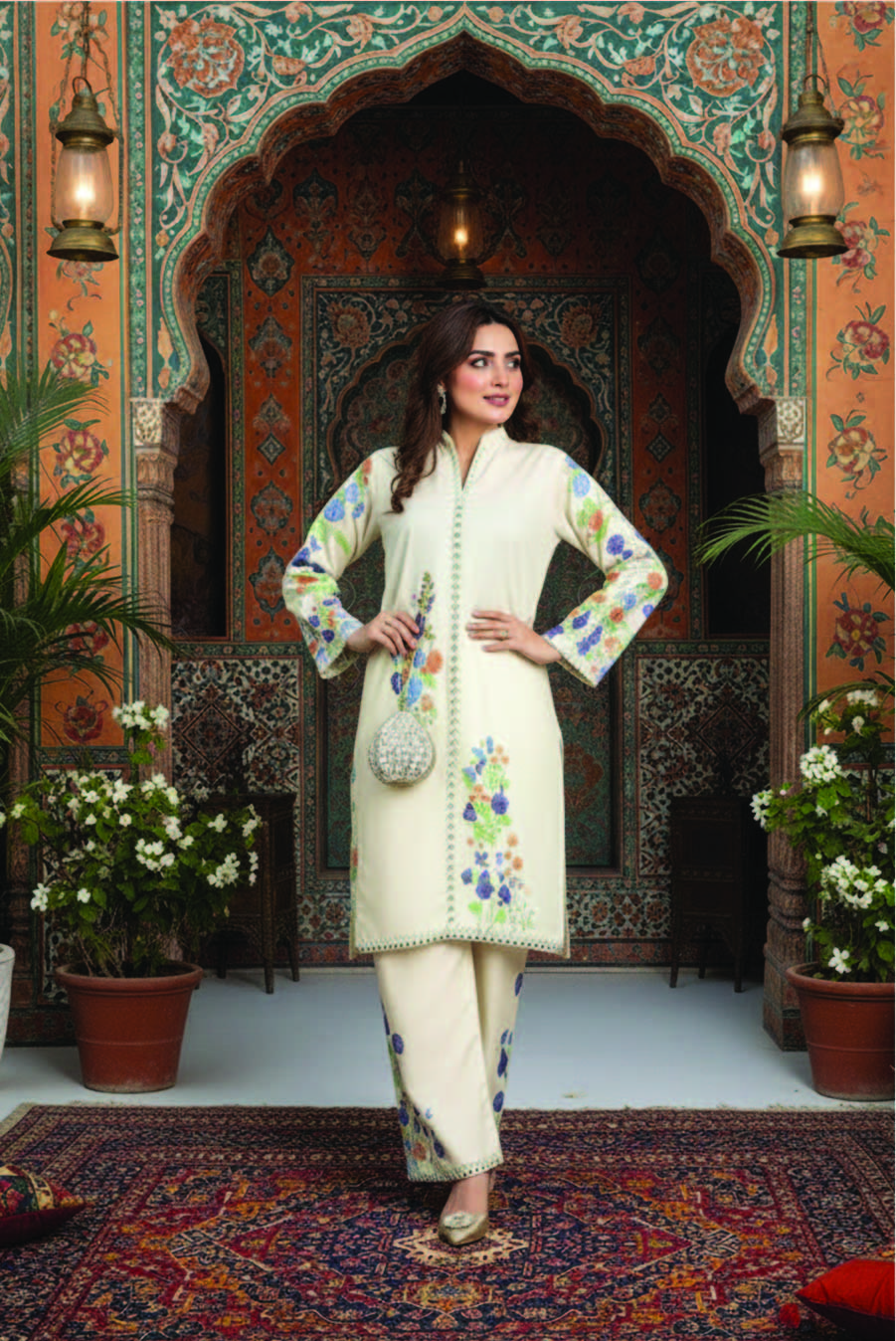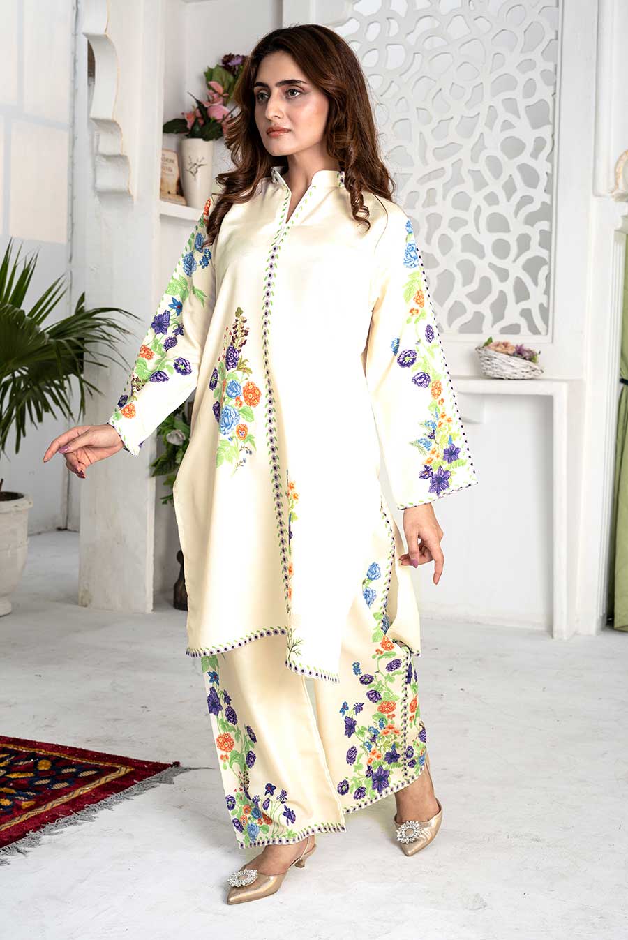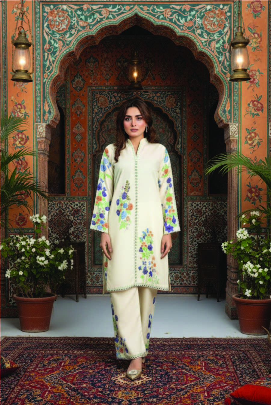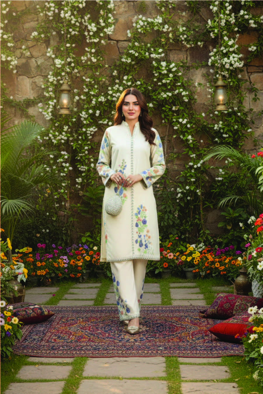 Celebrate the colors of spring with Bahaar. This ivory Polly Lawn suit is beautifully embellished